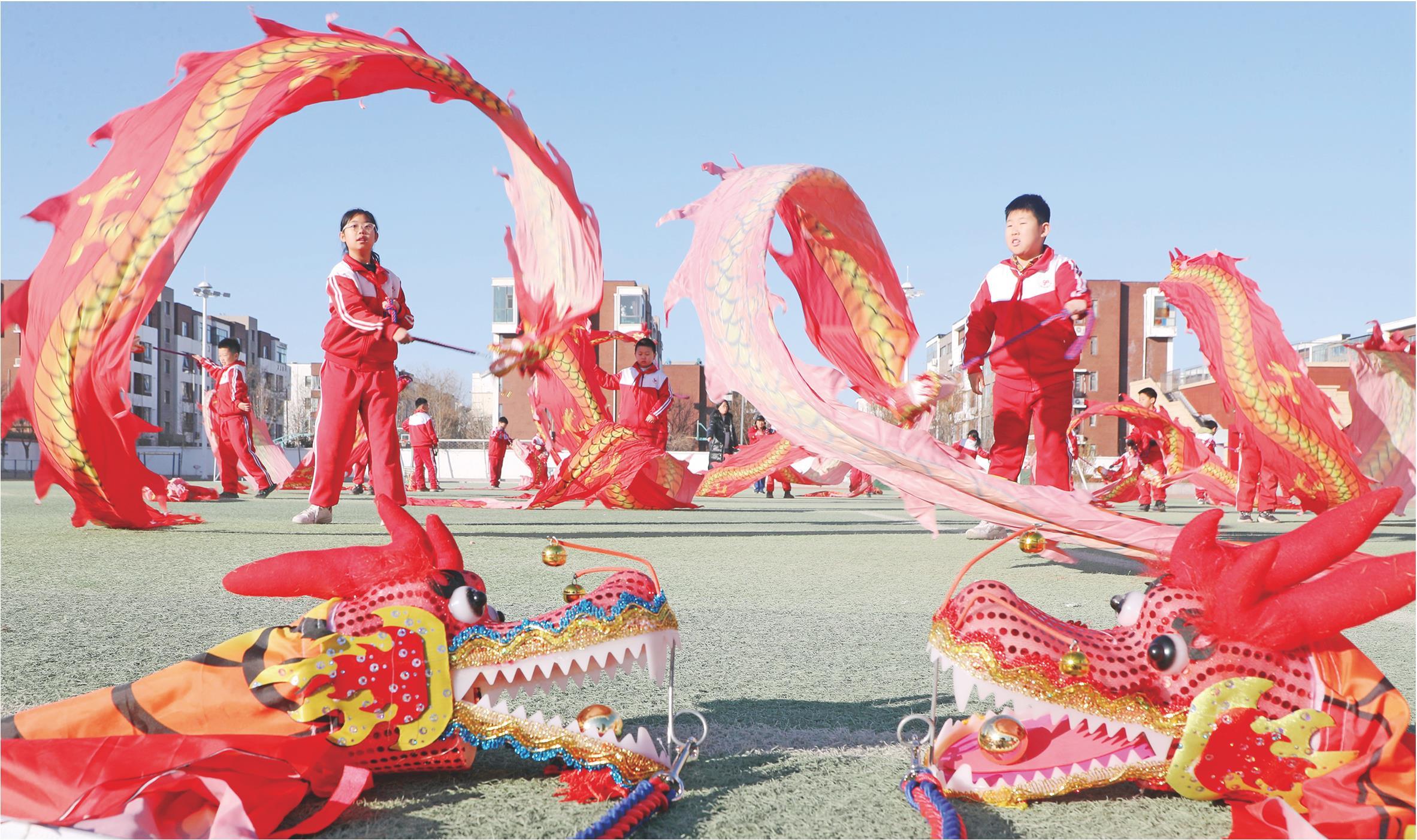 2024年12月26日,山东省东营市胜利实验小学小石榴舞龙社团学生舞动彩带龙,喜迎新年的到来。