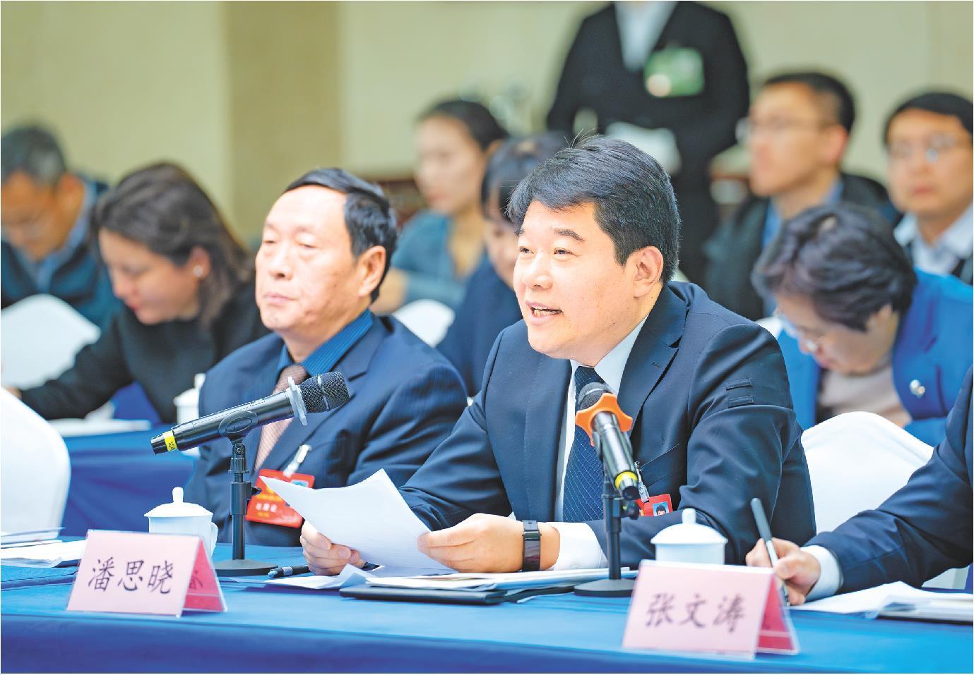 1月21日,在政协联组会议上,潘思晓(右)委员在发言中建议,持续加大工匠人才培育力度,为强省建设提供技能和人才支撑。