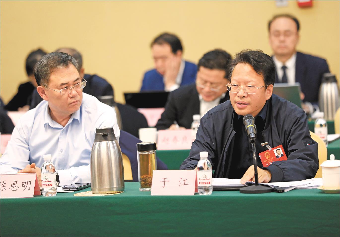 1月21日,出席省十四届人大三次会议的于江(右)代表就打造高水平对外开放新高地,推进“万企出海 鲁贸全球”发表意见。