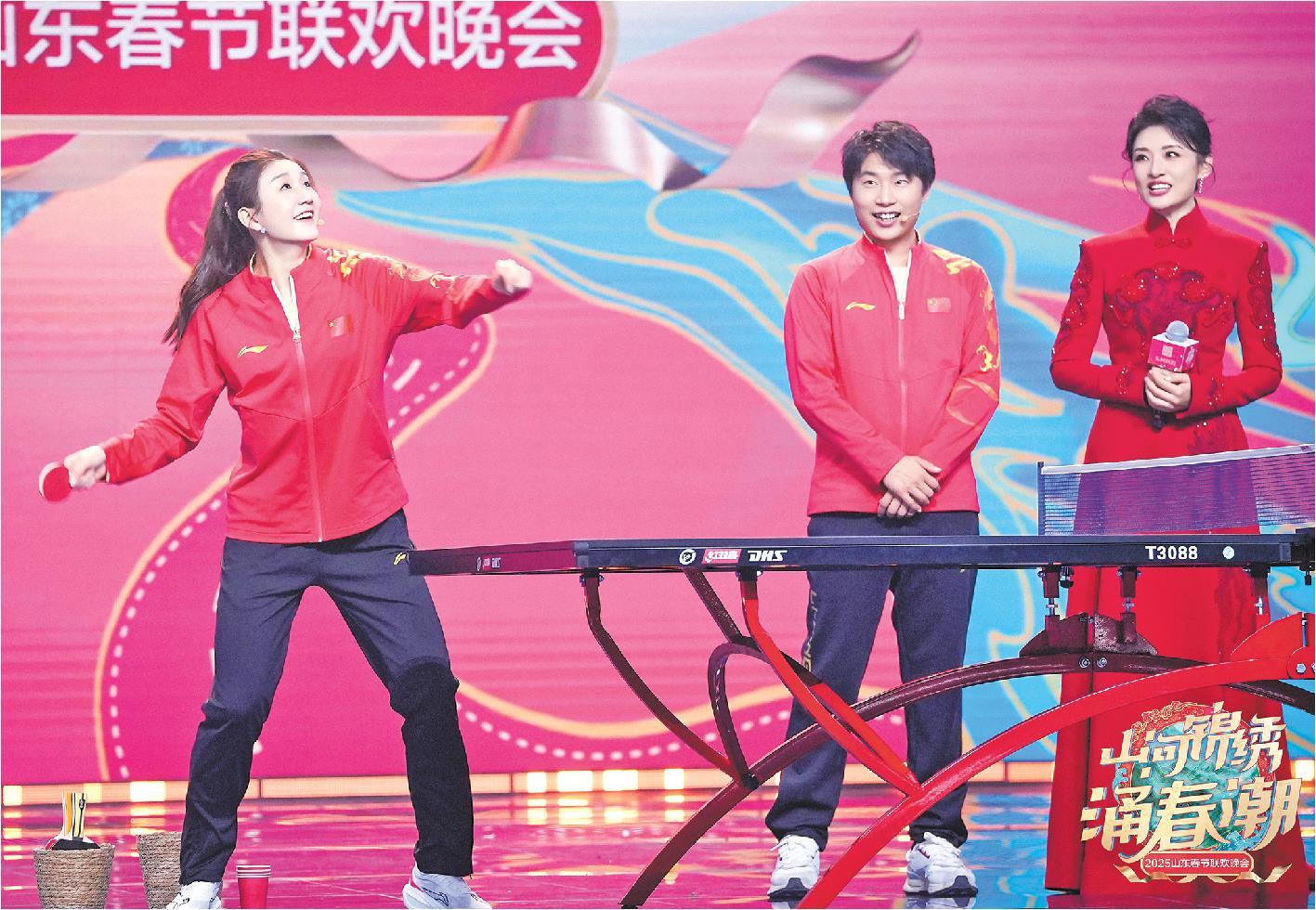 山东春晚现场,奥运冠军陈梦(左)、李越宏(中)和家乡父老一起欢乐迎新年。
