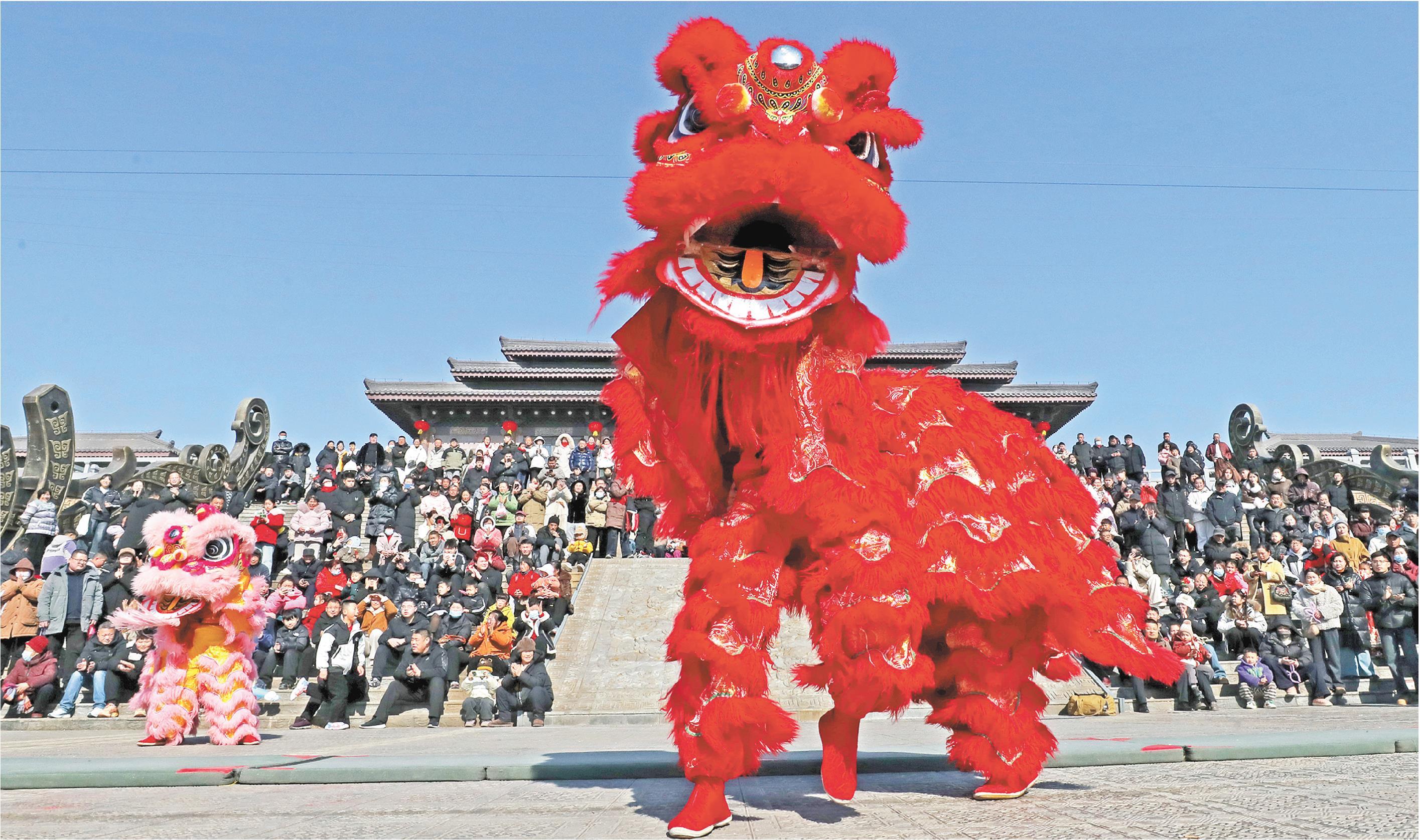 1月29日,在临沂市郯城县郯国古城景区,演员在表演舞狮。