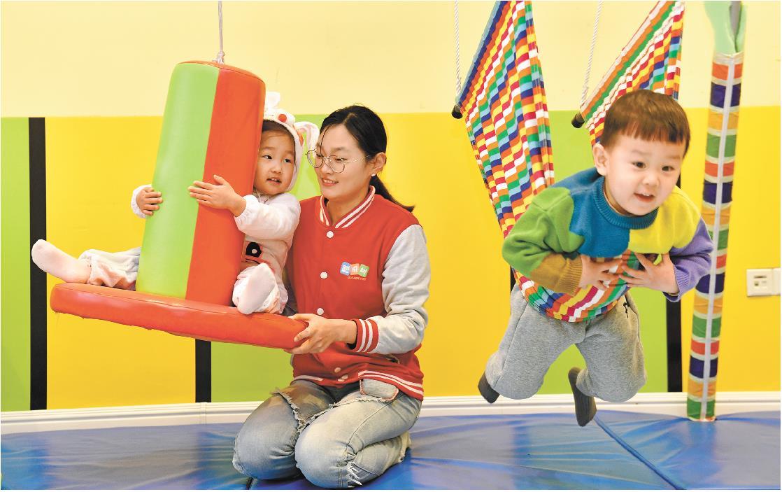 2月20日,日照市东港区知子树托幼园,孩子在做感统训练。东港区探索打造“托幼一体化”托育服务体系,目前开展托育服务的机构有145家,普惠率86.9%。(□新华社记者 郭绪雷 报道)