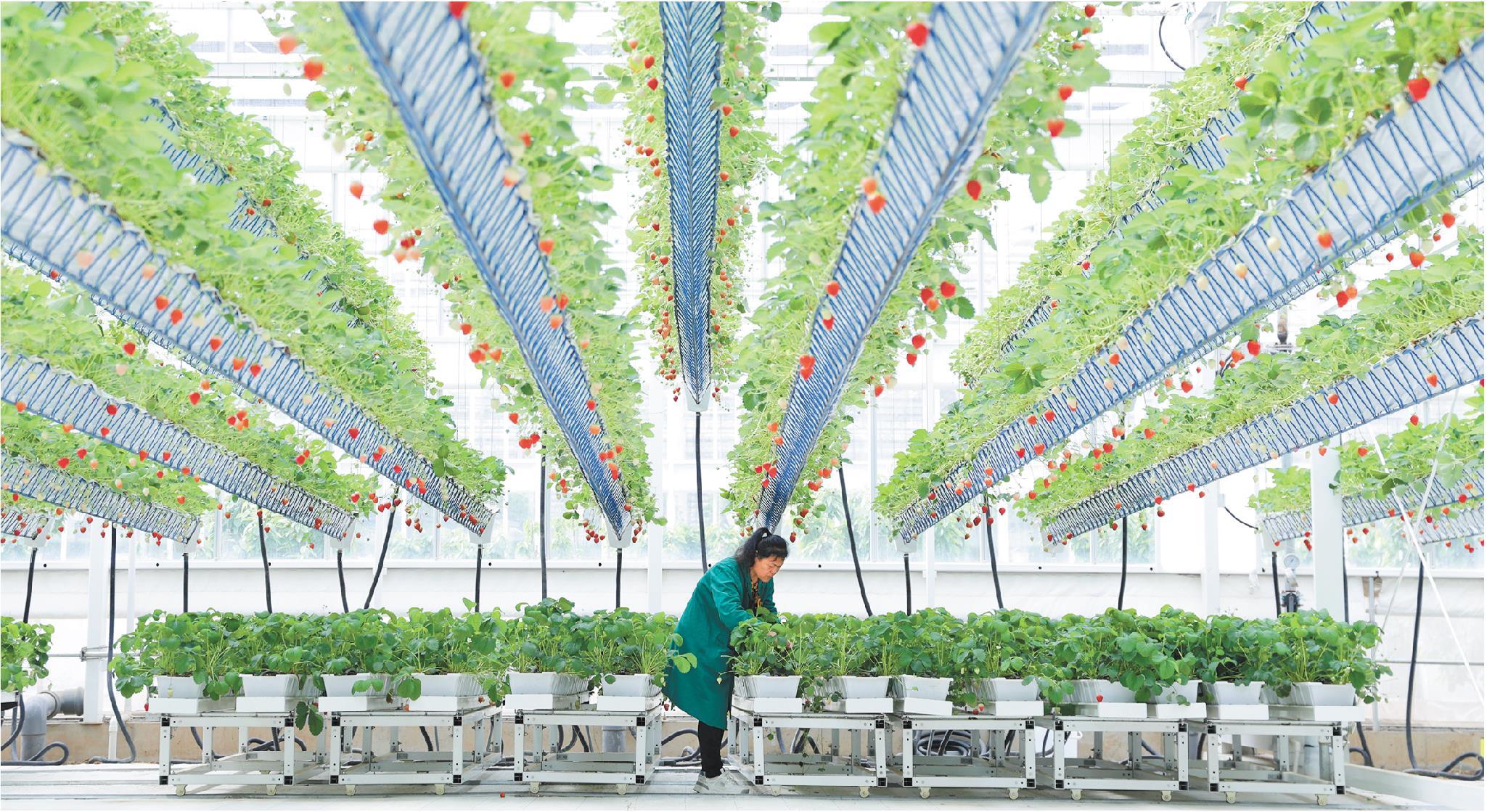 聊城市茌平区信发现代农业产业园智能玻璃温室大棚里,工作人员在管护草莓。(□通讯员 马红坤 报道)