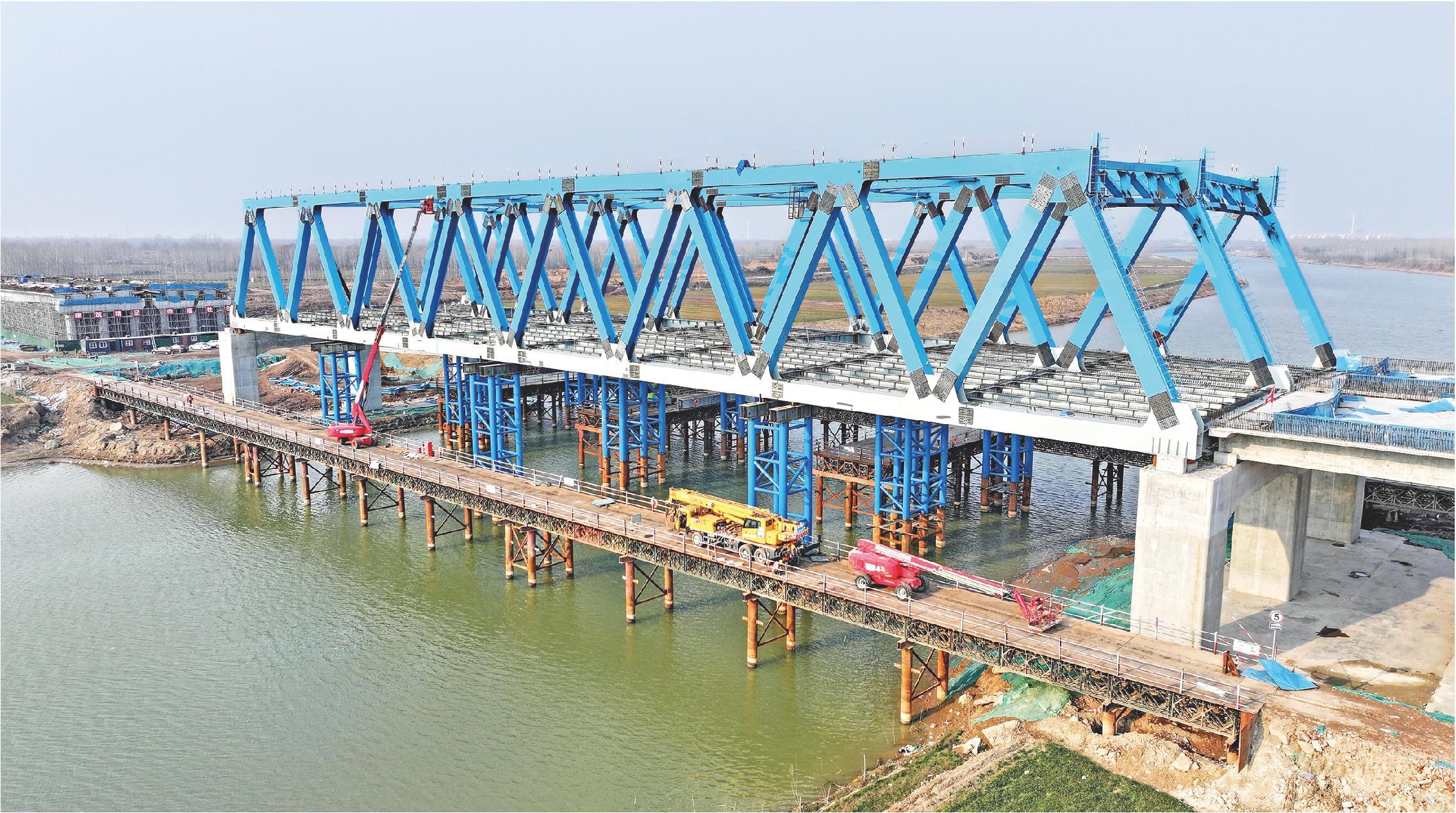 4月16日,在德州市临邑县李集村,济南至宁津高速项目徒骇河大桥建设正如火如荼地进行,天蓝色的钢结构主桥横跨在宽约百米的徒骇河上,工人们配合着机械紧张有序地进行施工作业。