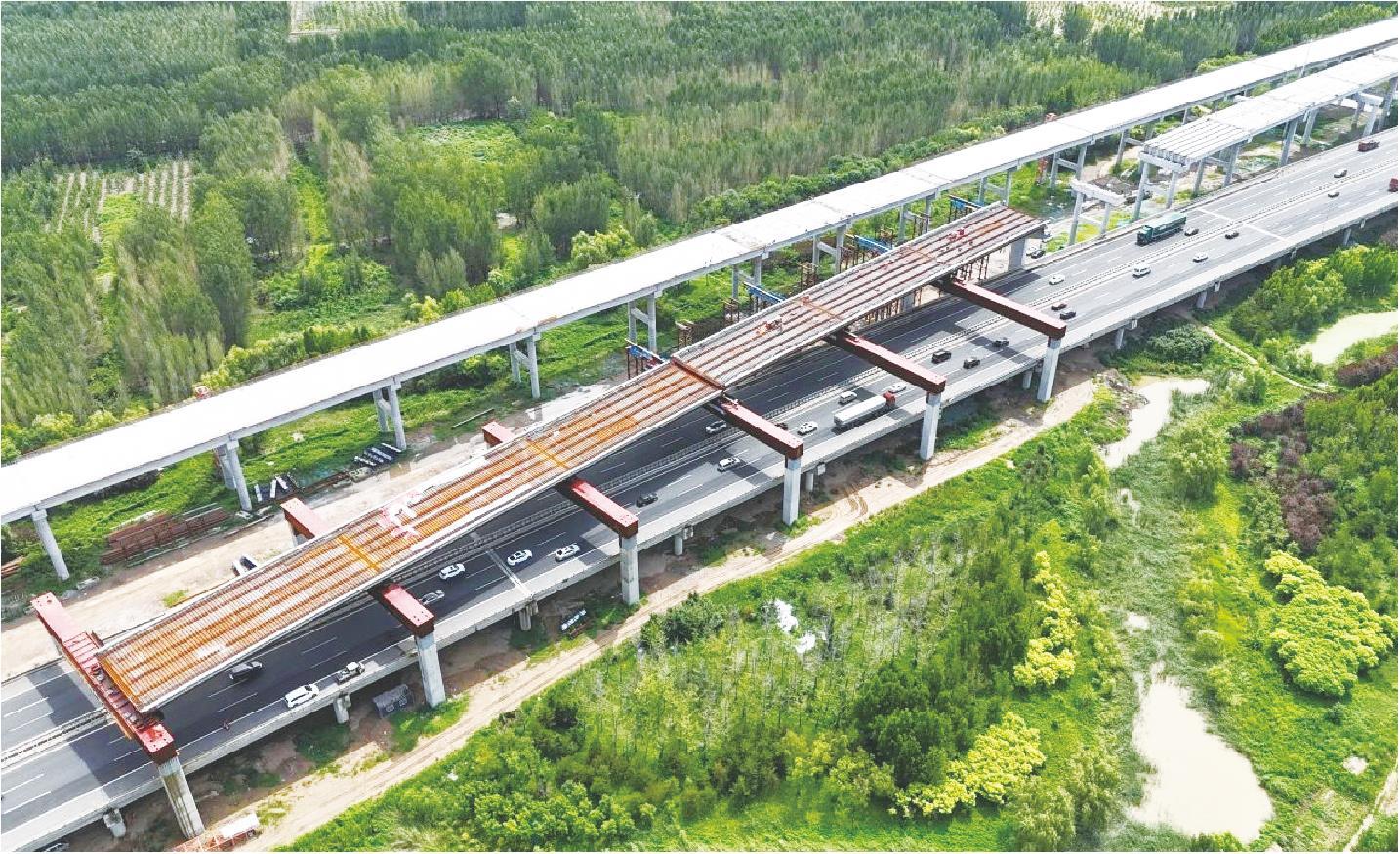 “在小角度跨越既有道路施工环节,我们采用原位拼装加侧向横移相结合的方式,即在联墩旁的拼装平台上对杆件梁体进行组装焊接,检测合格后进行横移施工。”项目办质量安全处处长姚望说,“这种施工方式犹如在交通动脉上实施精密外科手术,整个过程对既有高速公路车辆的正常行驶毫无影响。”