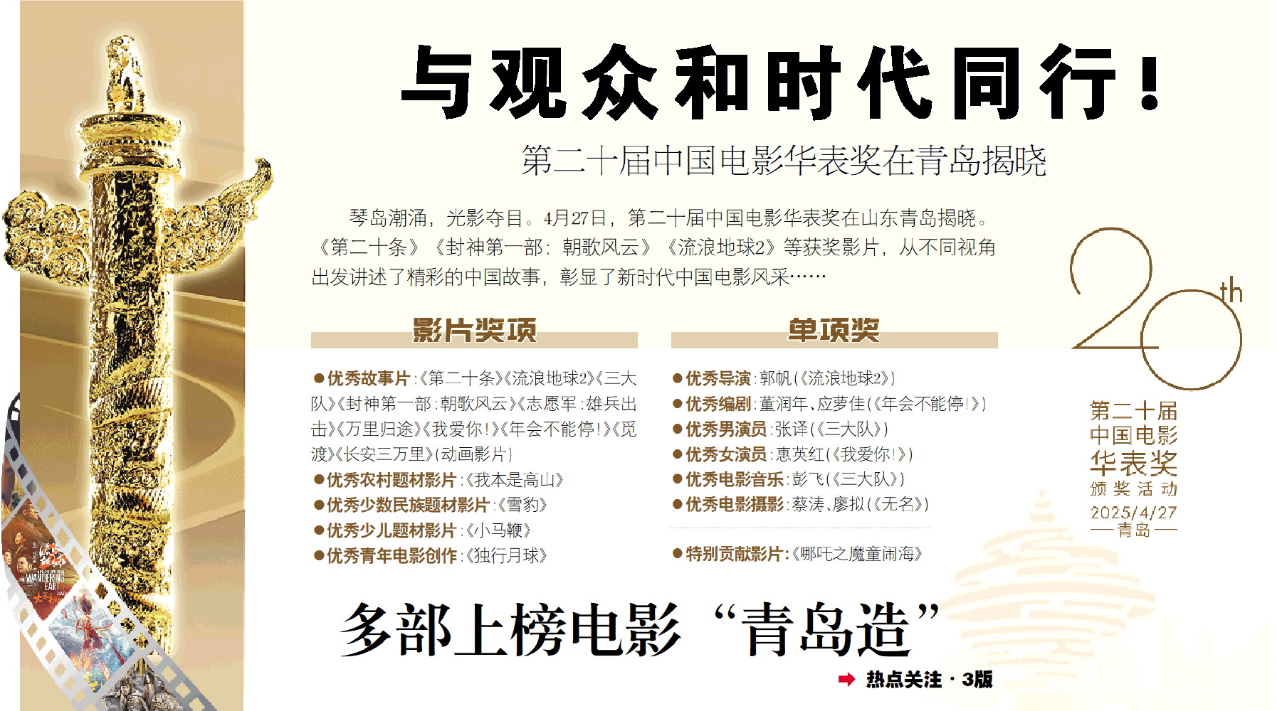 琴岛潮涌,光影夺目。4月27日,第二十届中国电影华表奖在山东青岛揭晓。《第二十条》《封神第一部:朝歌风云》《流浪地球2》等获奖影片,从不同视角出发讲述了精彩的中国故事,彰显了新时代中国电影风采……