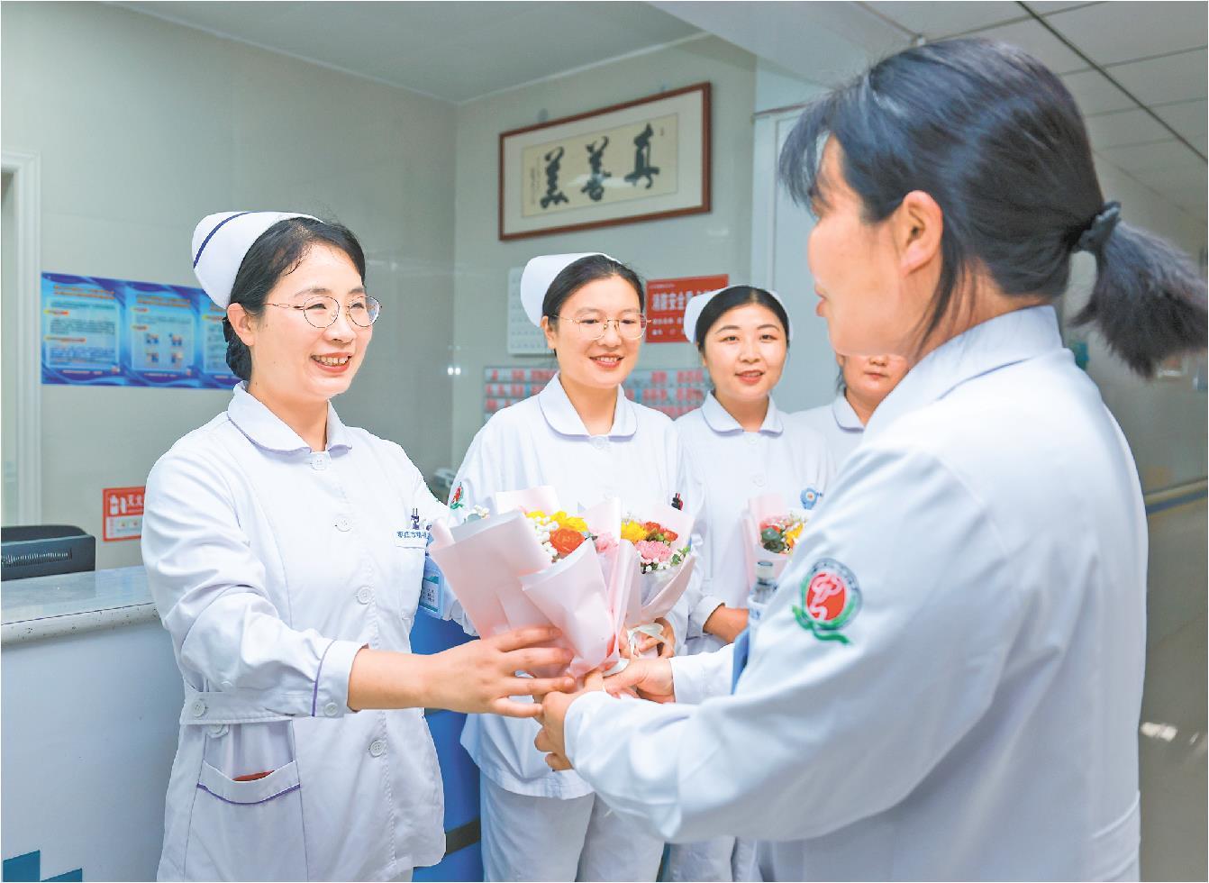 5月10日,在枣庄市精神卫生中心,医生给护士献花。