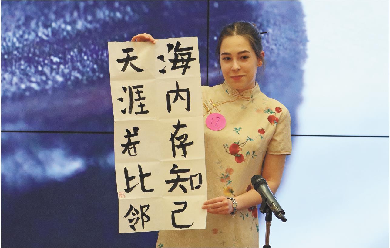 5月10日,在罗马尼亚克卢日-纳波卡,选手在第24届“汉语桥”世界大学生中文比赛罗马尼亚赛区决赛上展示书法作品。(□新华社发)