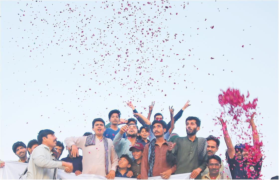 5月10日,在巴基斯坦东部旁遮普省木尔坦市,人们在巴基斯坦和印度宣布停火后庆祝。(□新华社发)