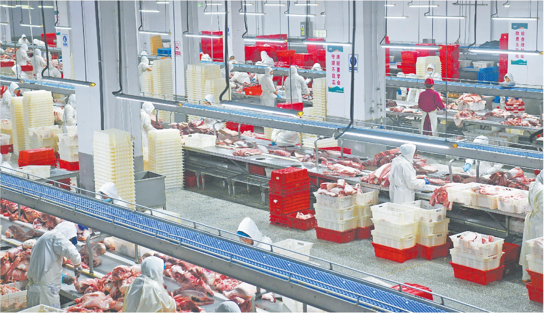 近年来,枣庄市山亭区立足特色农业优势资源,推进一二三产业融合发展,省级以上农业产业化重点龙头企业达到11家。图为山东融跃肉制品有限公司现代化高标准恒温生产车间内,工人正在猪肉分割生产线上有序作业。