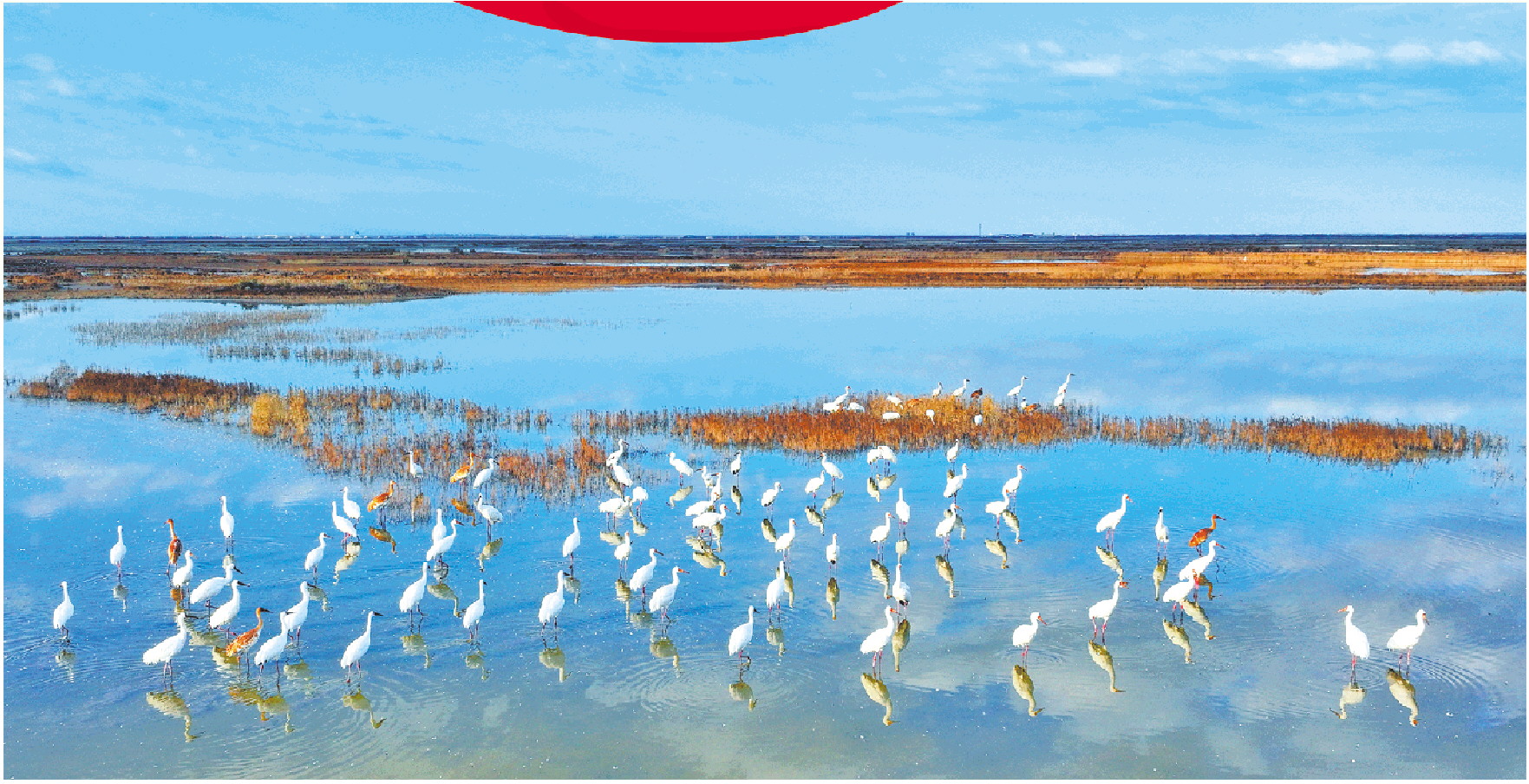 近日,在黄河三角洲国家级自然保护区,野生鸟类在湿地内栖息。