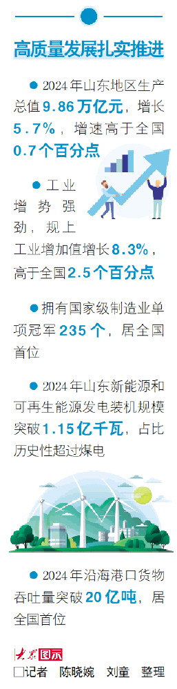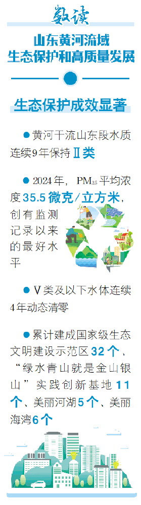 2024年5月,习近平总书记视察山东时强调,山东要在推动黄河流域生态保护和高质量发展上走在前。山东牢牢把握高质量发展这一首要任务,紧紧扭住“在发展中保护、在保护中发展”这一基准线,塑造高质量发展新优势:2024年,全省GDP达9.86万亿元;生态环境质量持续改善,黄河干流山东段水质连续9年保持Ⅱ类;山东成为联结沿黄省份和世界的桥梁,沿黄经济出海口的功能放大。当前,山东半岛城市群正发挥龙头作用,和沿黄“朋友圈”携手同行,一场生态保护与高质量发展的“双向奔赴”在黄河两岸展开。