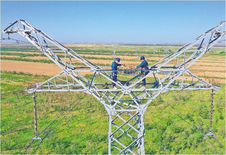 国网东营供电公司输电人员在220千伏海港I、II线14号铁塔为东方白鹳搭建人工鸟巢。(□记者 刘童 通讯员 李恒发 报道)