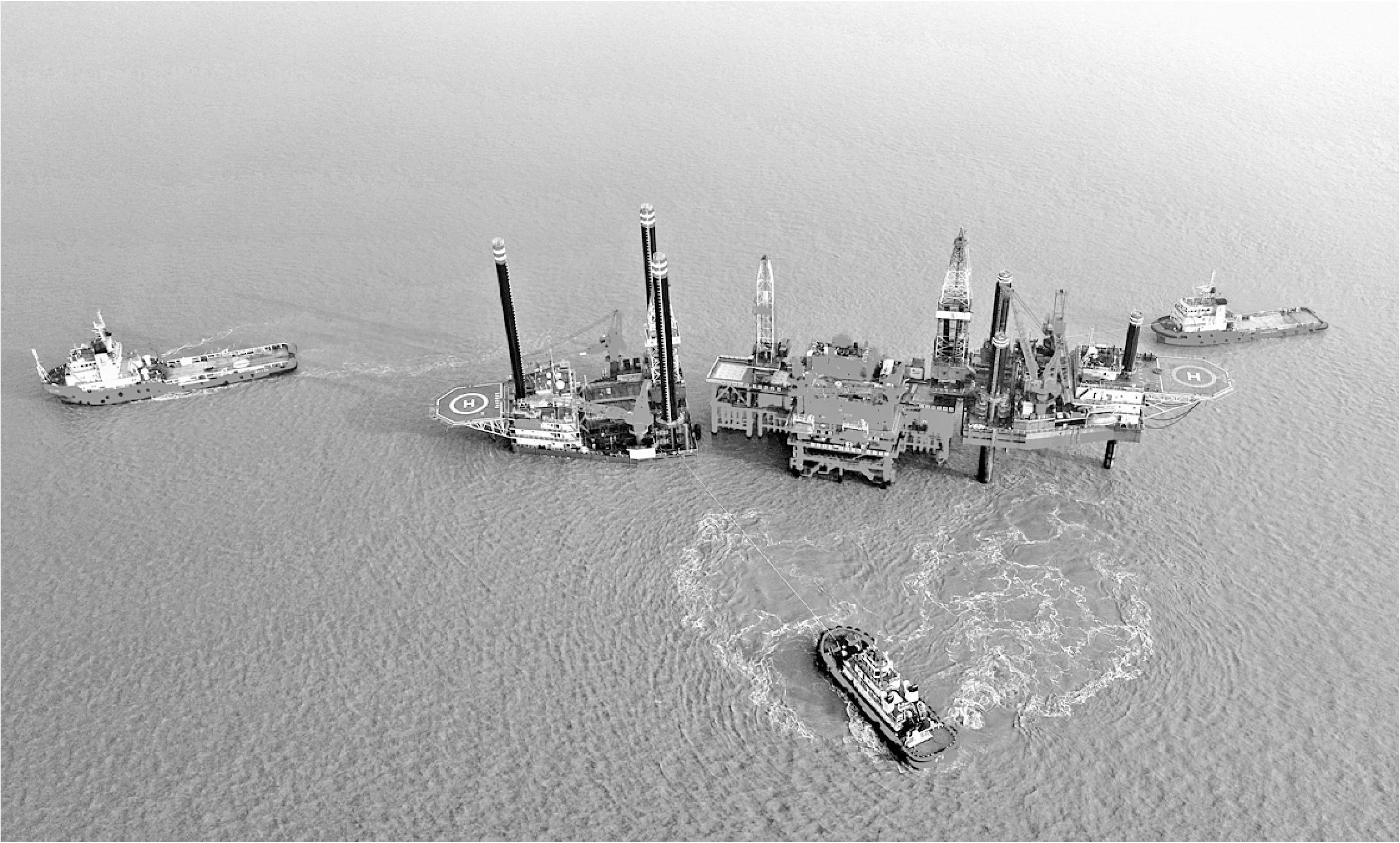 近日,渤海湾胜利埕岛油田,胜利267与胜利291、胜利242三艘船协力将作业六号平台就位到埕北22F井。