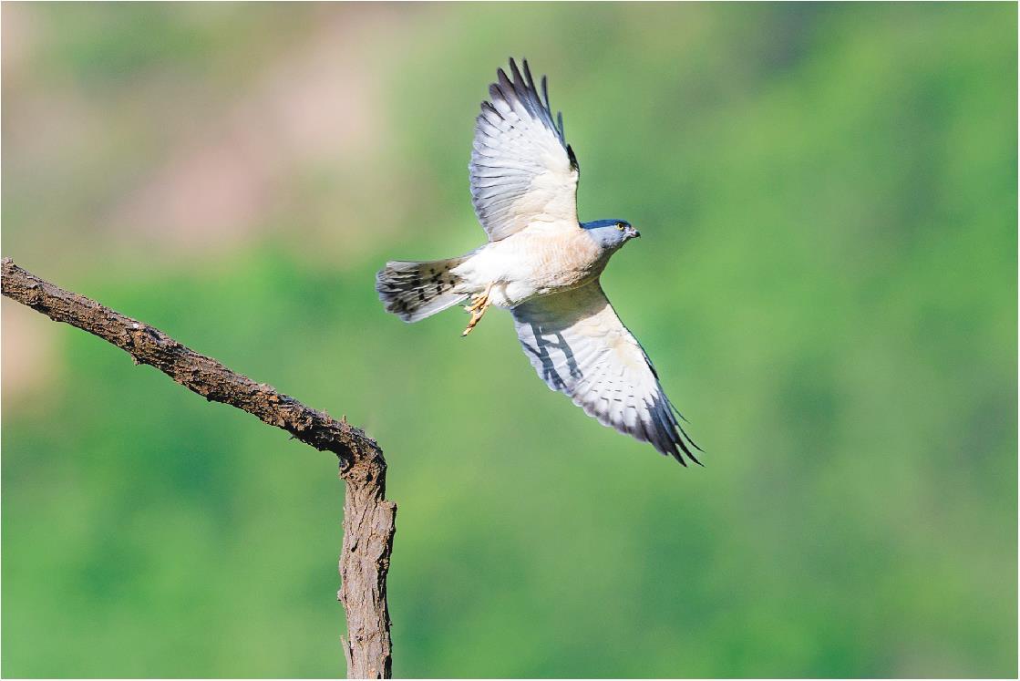 本报临朐讯 近日,在潍坊市临朐县沂山国家森林公园,摄影爱好者张清捕捉到国家二级保护动物赤腹鹰的身影(上图)。照片中赤腹鹰身姿矫健,羽翼舒展,或翱翔天际,或栖息枝头,尽显猛禽风采。