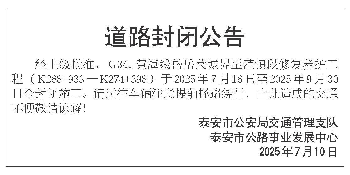 经上级批准,G341 黄海线岱岳莱城界至范镇段修复养护工程(K268+ 933—K274+ 398)于2025年7月16日至2025年9月30日全封闭施工。请过往车辆注意提前择路绕行,由此造成的交通不便敬请谅解!