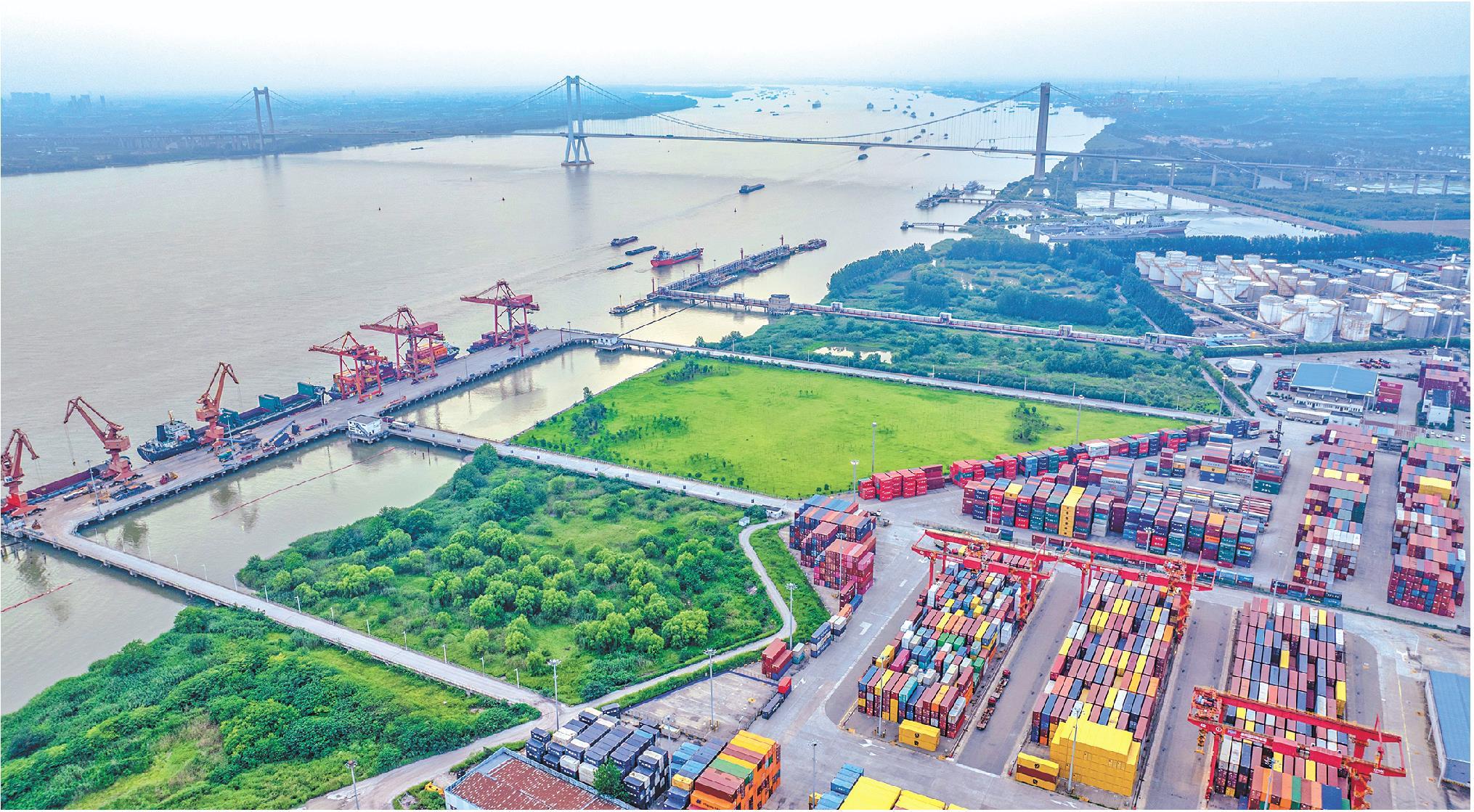 近日,在江苏泰州港集装箱码头,货船停在泊位装卸集装箱(无人机照片)。(□新华社发)