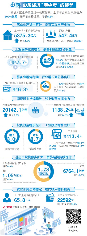 7月21日,山东上半年经济数据发布:全省生产总值为50046亿元,按不变价格计算,增长5.6%,经济发展顺利实现“双过半”,高质量发展扎实推进。