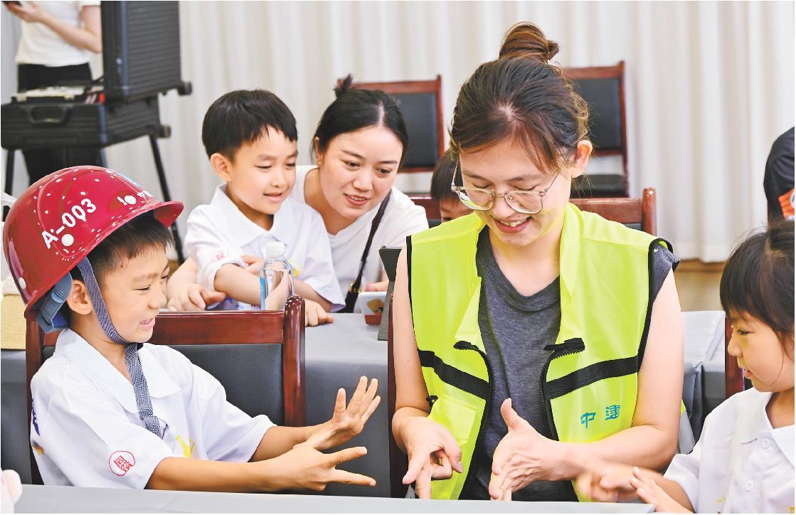 7月22日,在青岛市城阳区中建八局一项目部,家长和孩子互动。当日,“同心聚力 共护未来”暑期关爱留守儿童活动举办。