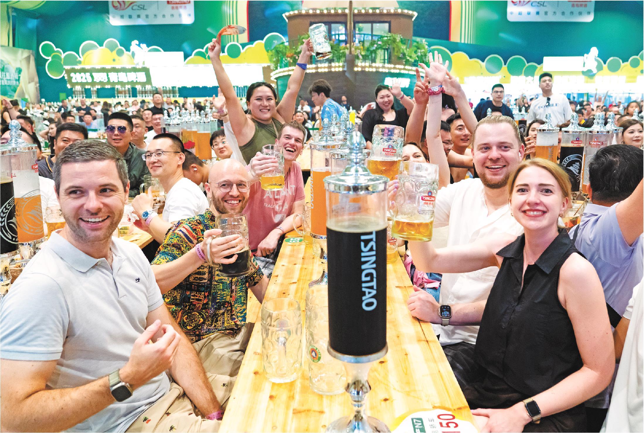 7月19日,中外游客在青岛西海岸新区金沙滩啤酒城大篷内畅饮。