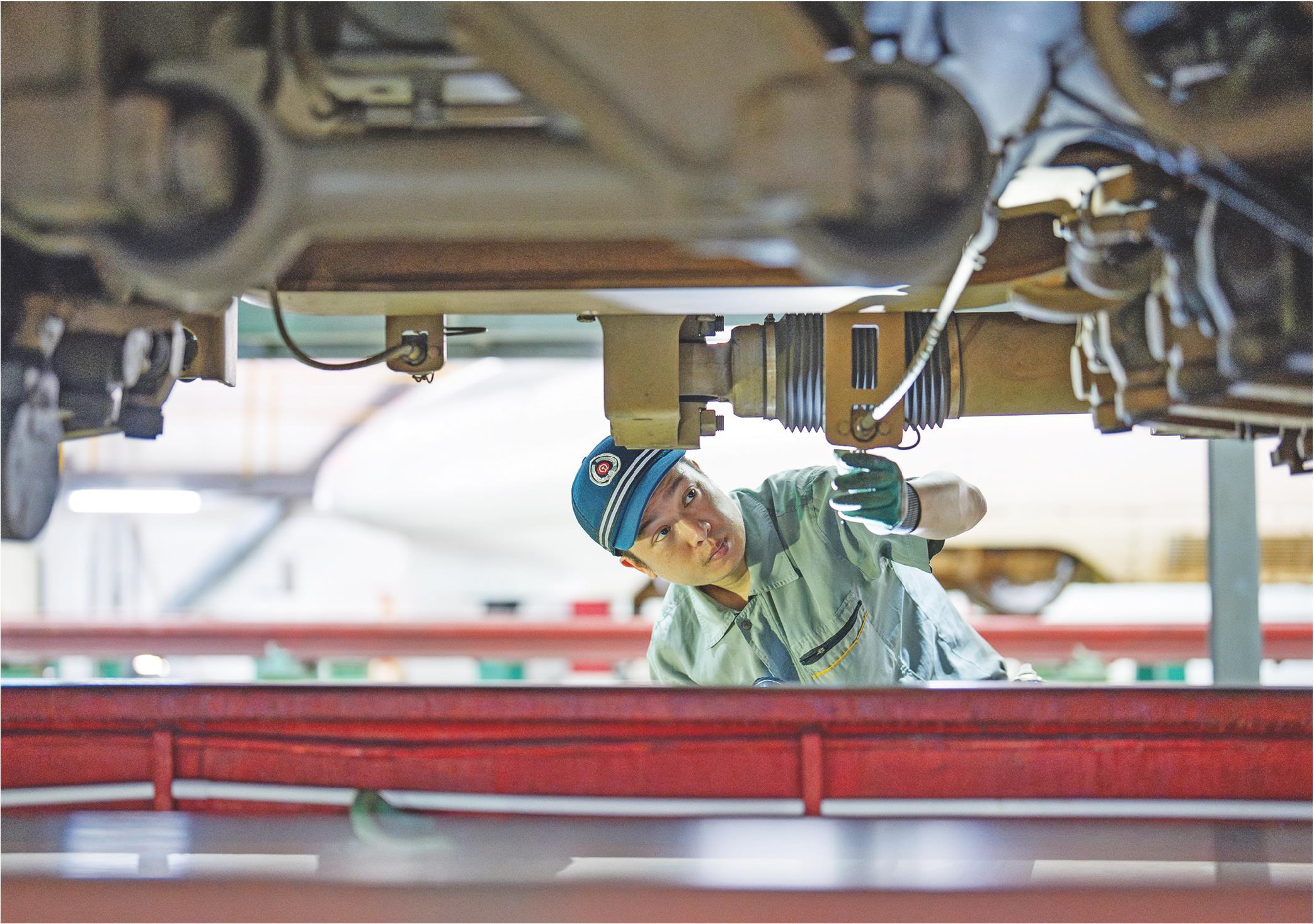 图为动车组机械师检查动车底部状态。