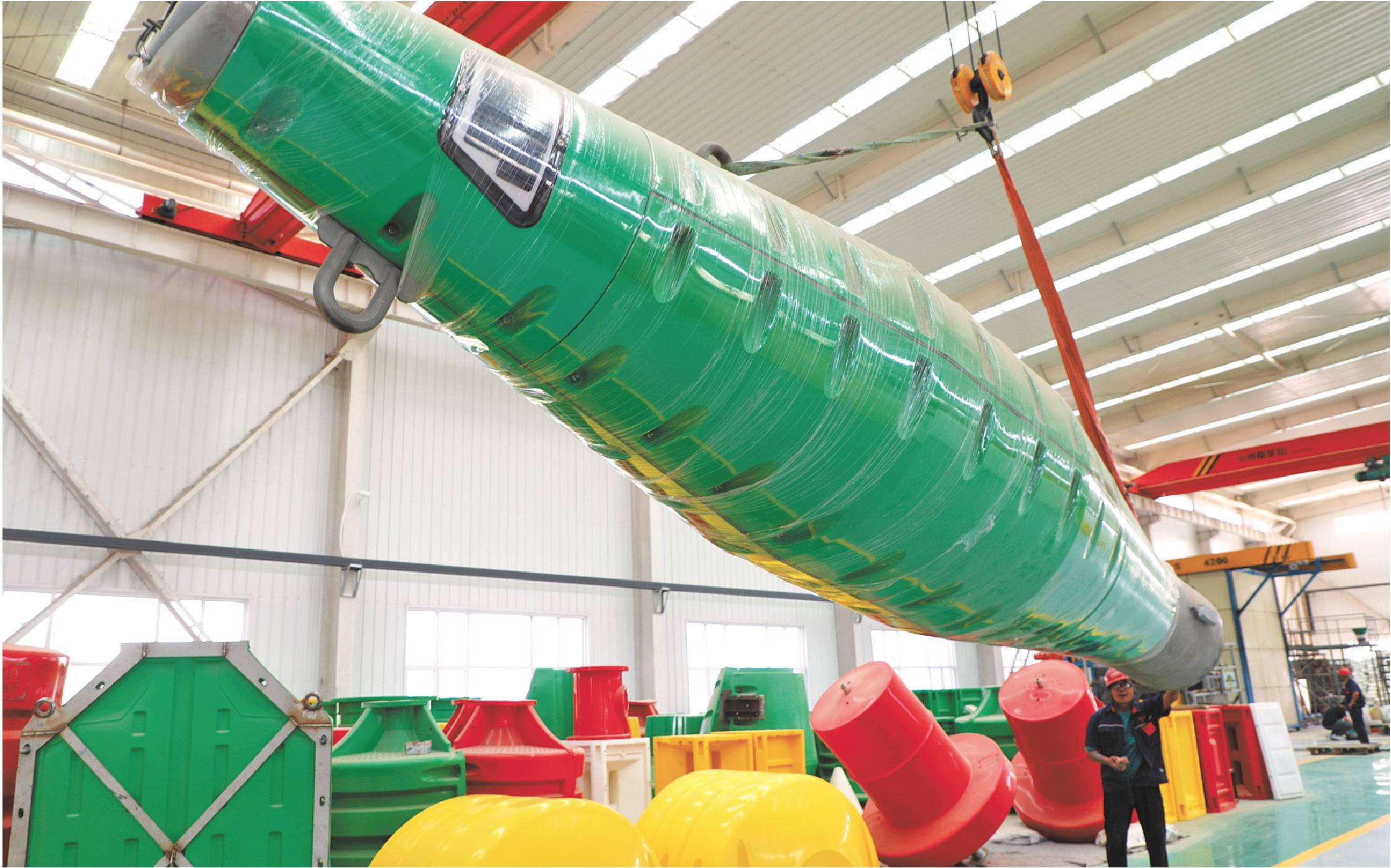 图为工人在车间里吊装海上浮标。