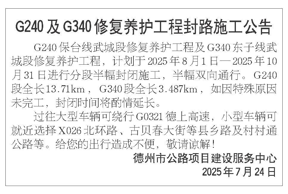 G240 保台线武城段修复养护工程及G340 东子线武城段修复养护工程,计划于2025年8月1日—2025年10月31日进行分段半幅封闭施工,半幅双向通行。G240 段全长13.71km,G340 段全长3.487km,如因特殊原因未完工,封闭时间将酌情延长。