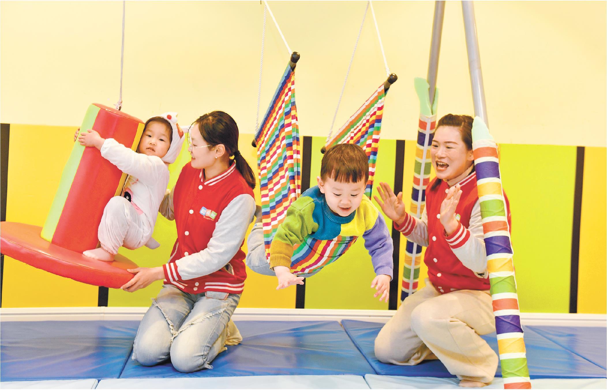 在日照市东港区知子树托幼园,老师陪伴孩子进行感统训练。 □新华社发