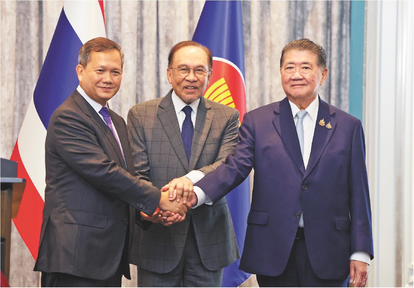 7月28日,在马来西亚布特拉加亚,马来西亚总理安瓦尔(中)、泰国代理总理普坦(右)和柬埔寨首相洪玛奈(左)握手。