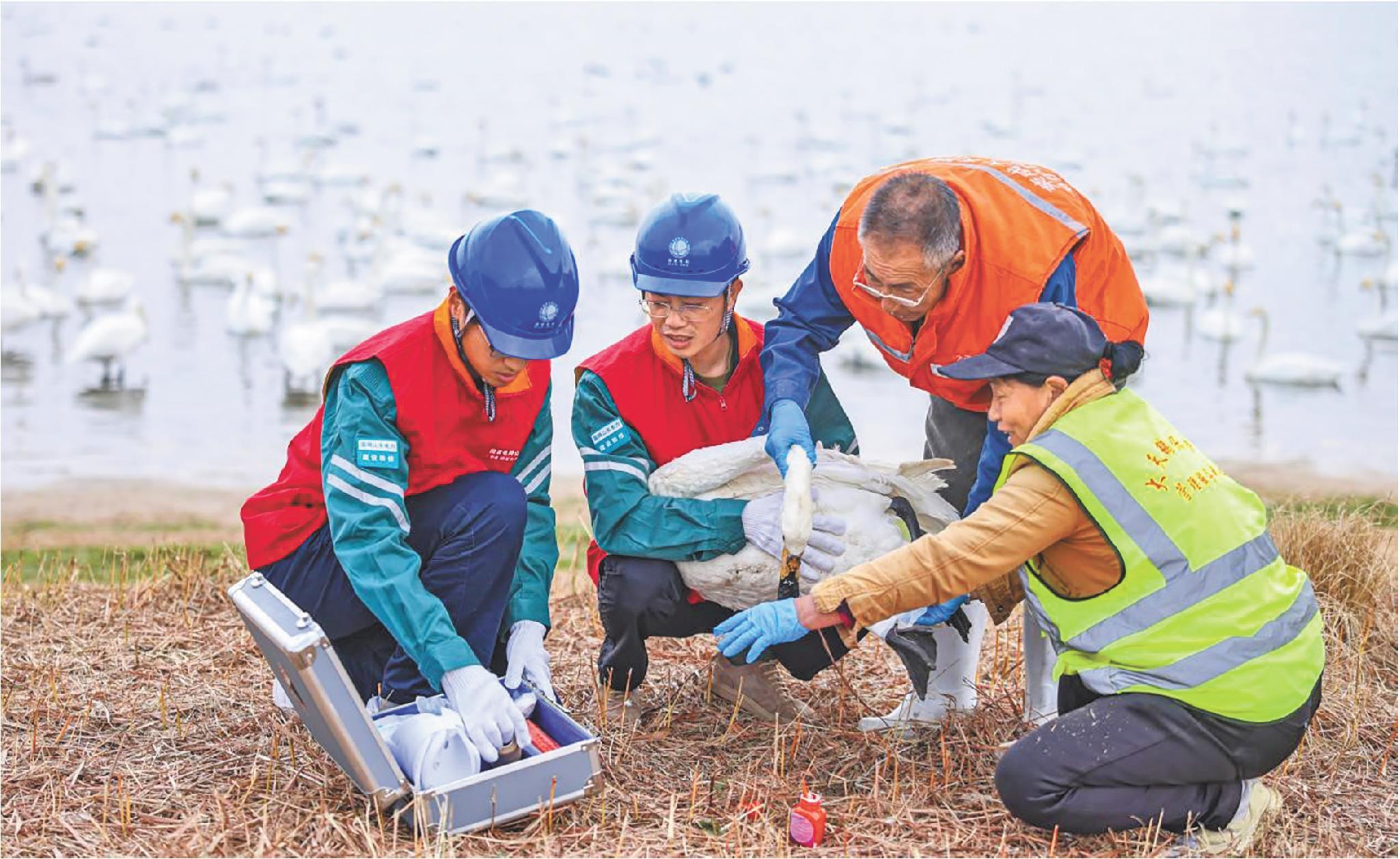 山东20个先进典型入选2024年度全国志愿服务“四个100”先进典型名单。其中,国家电网山东电力(威海)彩虹共产党员服务队2016年启动的“蓝色守护”保护大天鹅志愿服务项目,获评最佳志愿服务项目。图为志愿者在救治大天鹅。(□资料片)