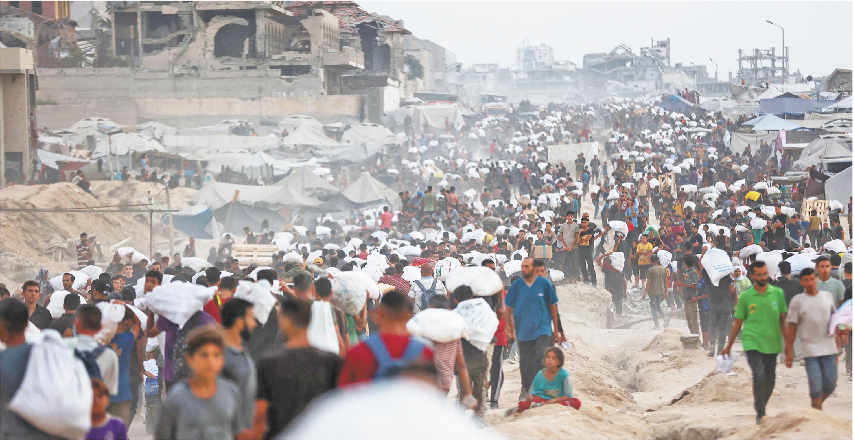 7月29日,在加沙地带北部城镇拜特拉希亚,人们领取援助物资。联合国粮农组织、世界粮食计划署和联合国儿童基金会29日发布联合声明警告,随着关键粮食和营养指标持续恶化,加沙地带正面临全面饥荒风险。