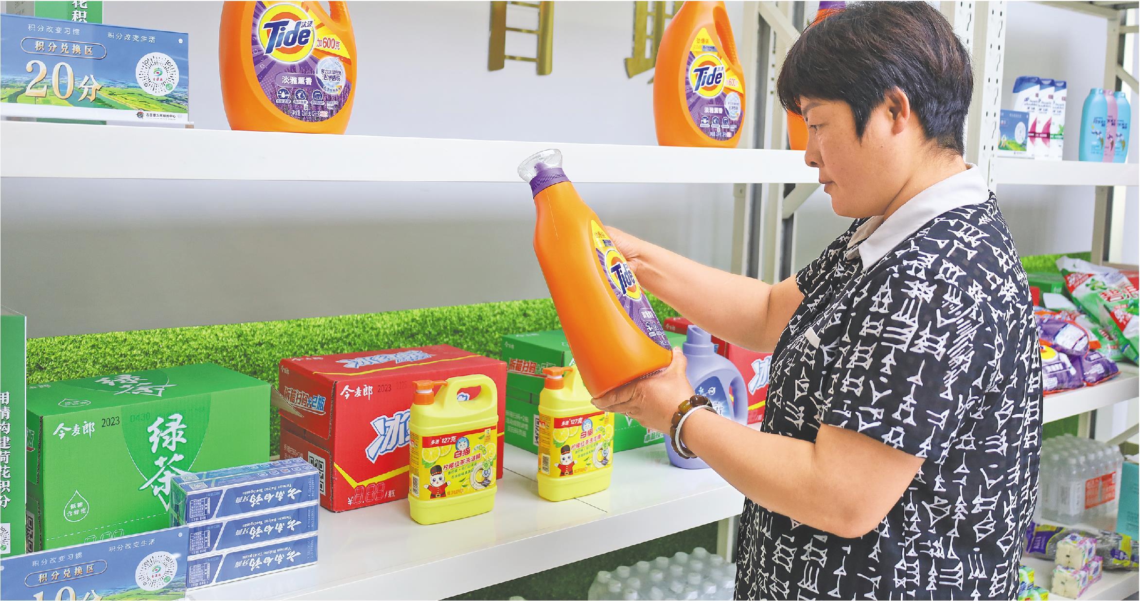 枣庄市峄城区着力打造“信用+村居(社区)”模式,将信用建设融入村居(社区)治理、志愿服务、网格化服务管理等基层工作。图为村民在古邵镇程庄村积分超市兑换洗衣液。