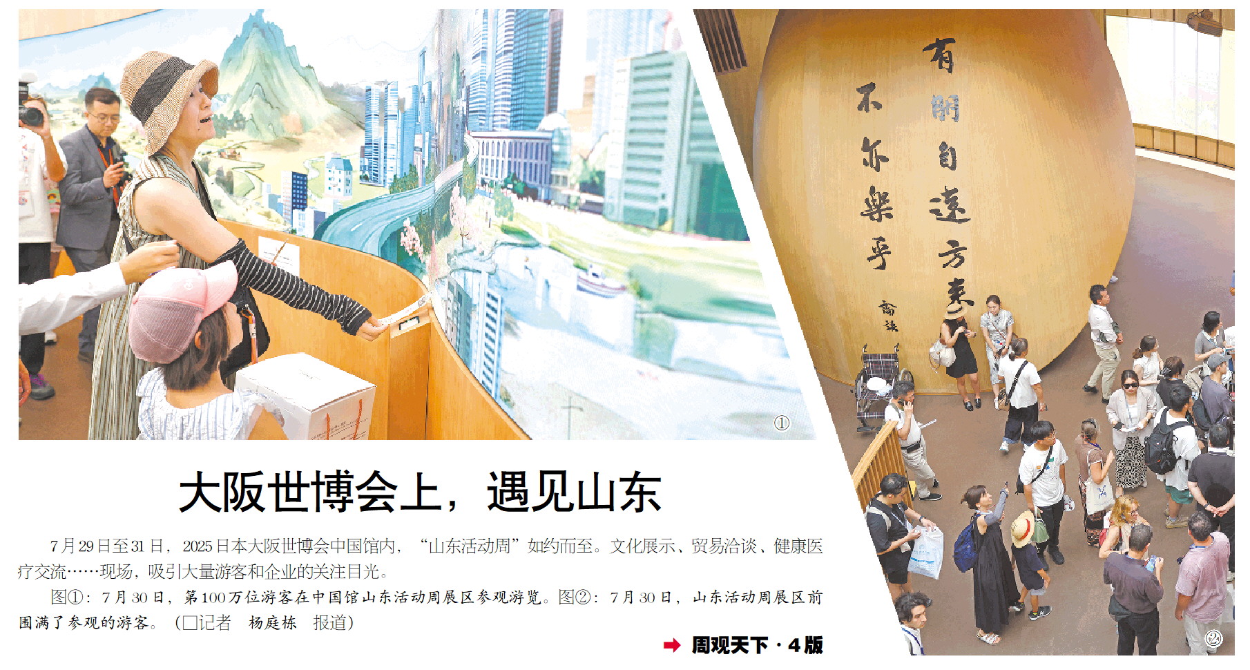 图①:7月30日,第100万位游客在中国馆山东活动周展区参观游览。图②:7月30日,山东活动周展区前围满了参观的游客。(□记者 杨庭栋 报道)