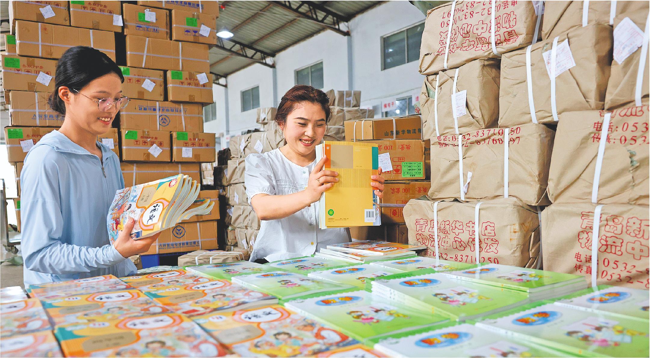 8月14日,枣庄市新华书店教材发行中心,工作人员在清点整理新学期小学教材。