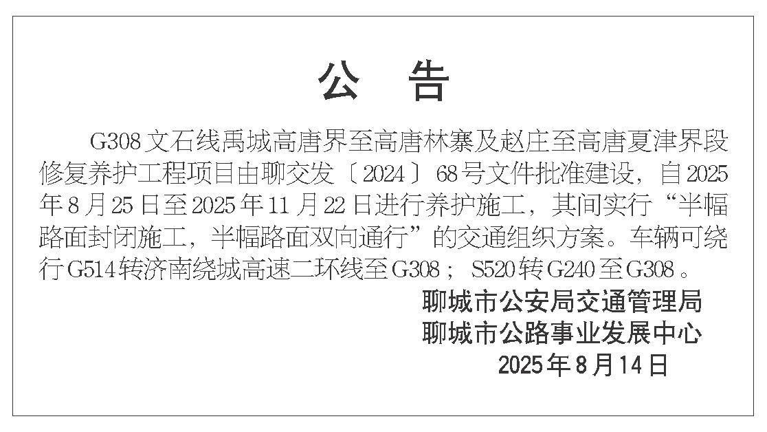 G308 文石线禹城高唐界至高唐林寨及赵庄至高唐夏津界段修复养护工程项目由聊交发〔2024〕68号文件批准建设,自2025年8月25日至2025年11月22日进行养护施工,其间实行“半幅路面封闭施工,半幅路面双向通行”的交通组织方案。车辆可绕行G514 转济南绕城高速二环线至G308 ;S520 转G240 至G308 。