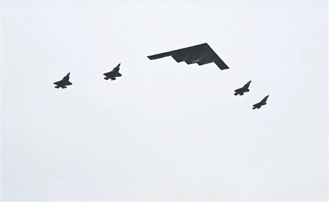 特朗普和普京走红毯时,两侧各停放两架美军F-22隐形战斗机。美军战机组成编队,从机场上空轰鸣飞过。两人望向天空。五角大楼官员向美国广播公司证实,组成编队的是一架B-2隐形战略轰炸机和4架F-35隐形战斗机。