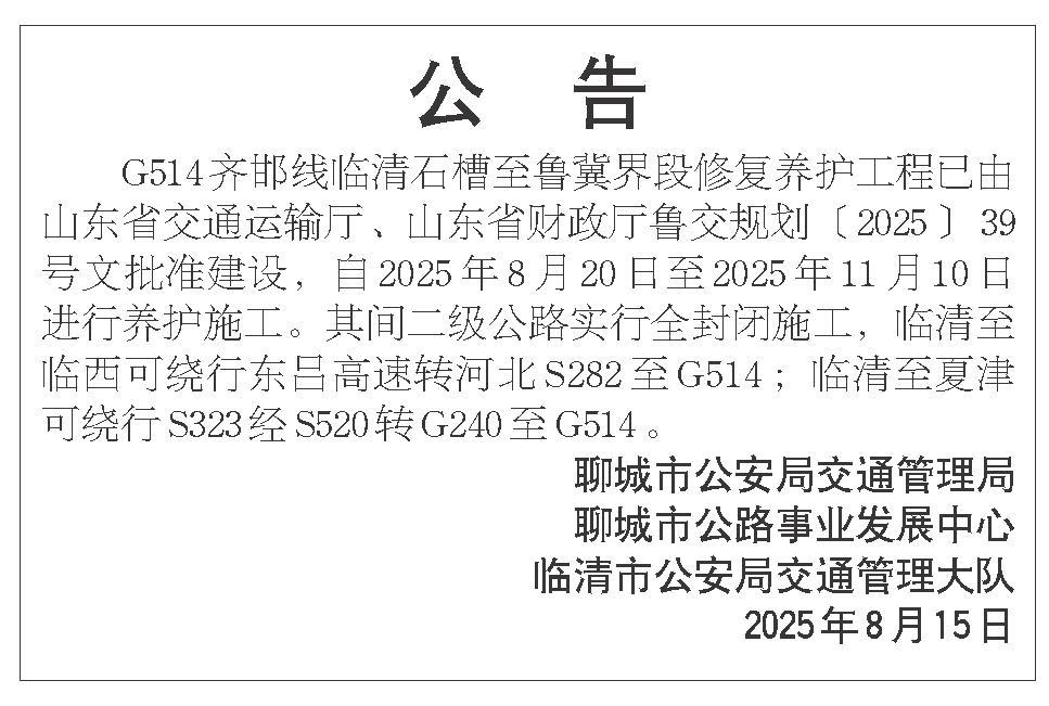 G514 齐邯线临清石槽至鲁冀界段修复养护工程已由山东省交通运输厅、山东省财政厅鲁交规划〔2025〕39号文批准建设,自2025年8月20日至2025年11月10日进行养护施工。其间二级公路实行全封闭施工,临清至临西可绕行东吕高速转河北S282 至G514 ;临清至夏津可绕行S323 经S520 转G240 至G514 。