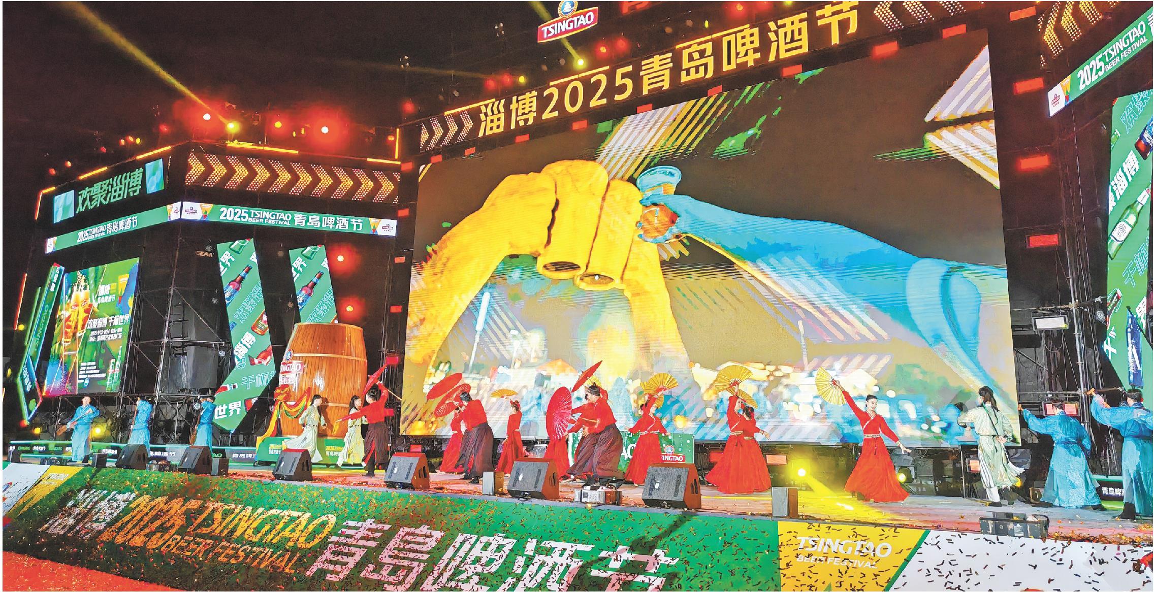 8月15日晚,淄博2025青岛啤酒节在淄博海月龙宫物流港开幕。