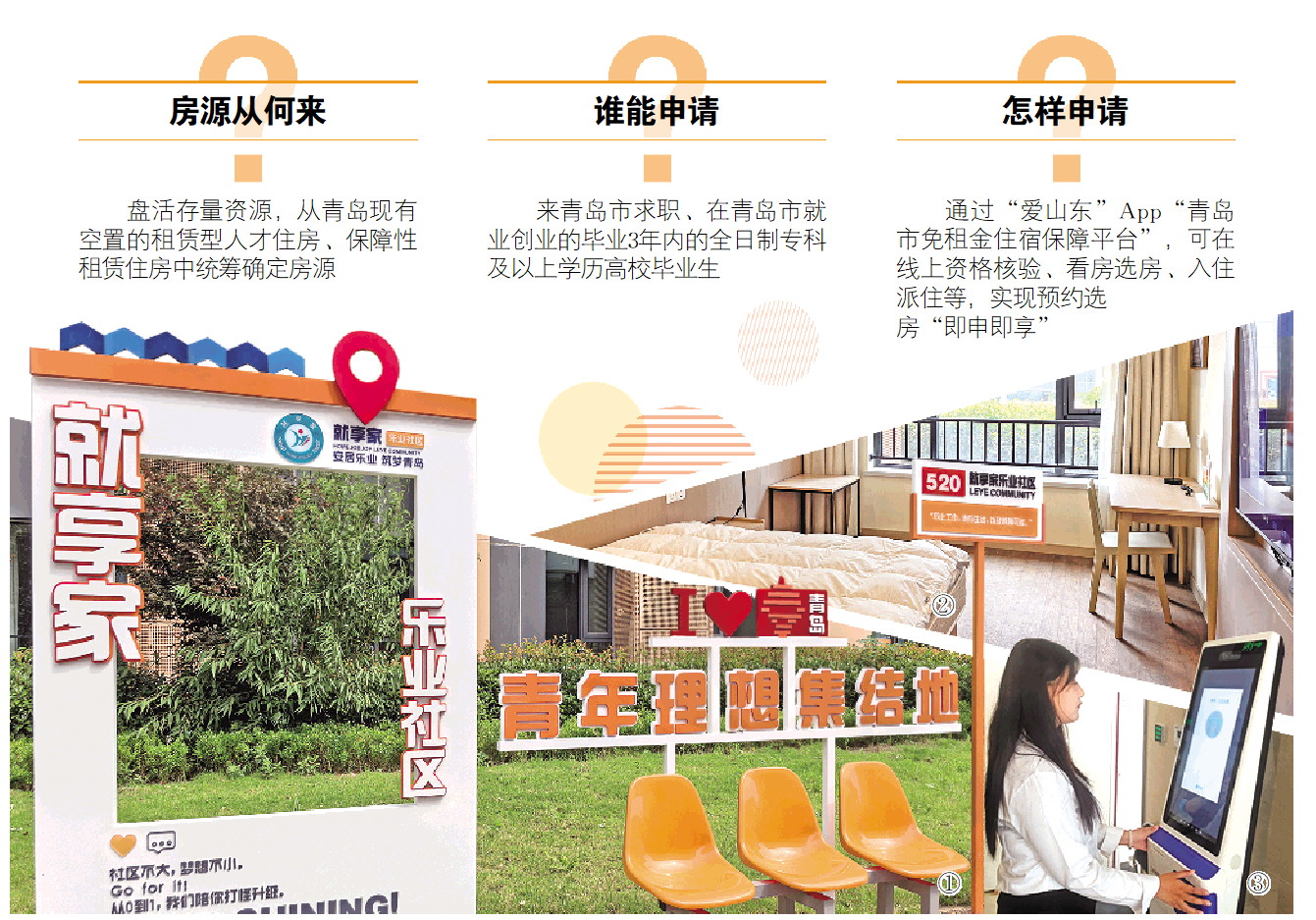 图①:青岛市城阳区龙海路“就享家”乐业社区项目。图②:入住毕业生居住的40平方米房间内景。图③:入住毕业生在“就享家”乐业社区一处求职机上刷脸求职。(□记者 薄克国 通讯员 孙英杰 报道)
