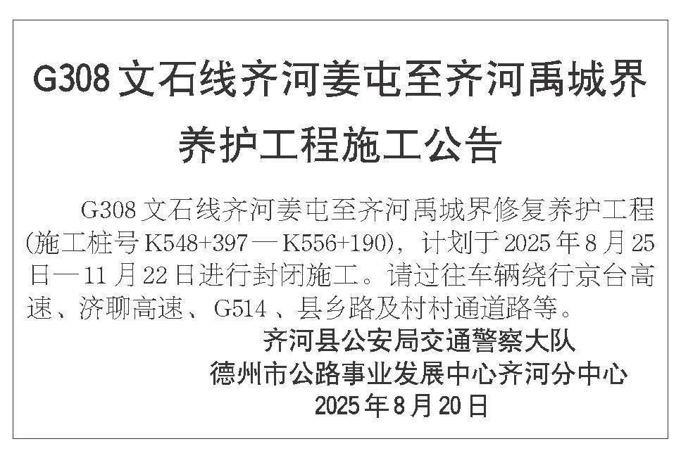 G308 文石线齐河姜屯至齐河禹城界修复养护工程(施工桩号K548+ 397—K556+ 190),计划于2025年8月25日—11月22日进行封闭施工。请过往车辆绕行京台高速、济聊高速、G514 、县乡路及村村通道路等。