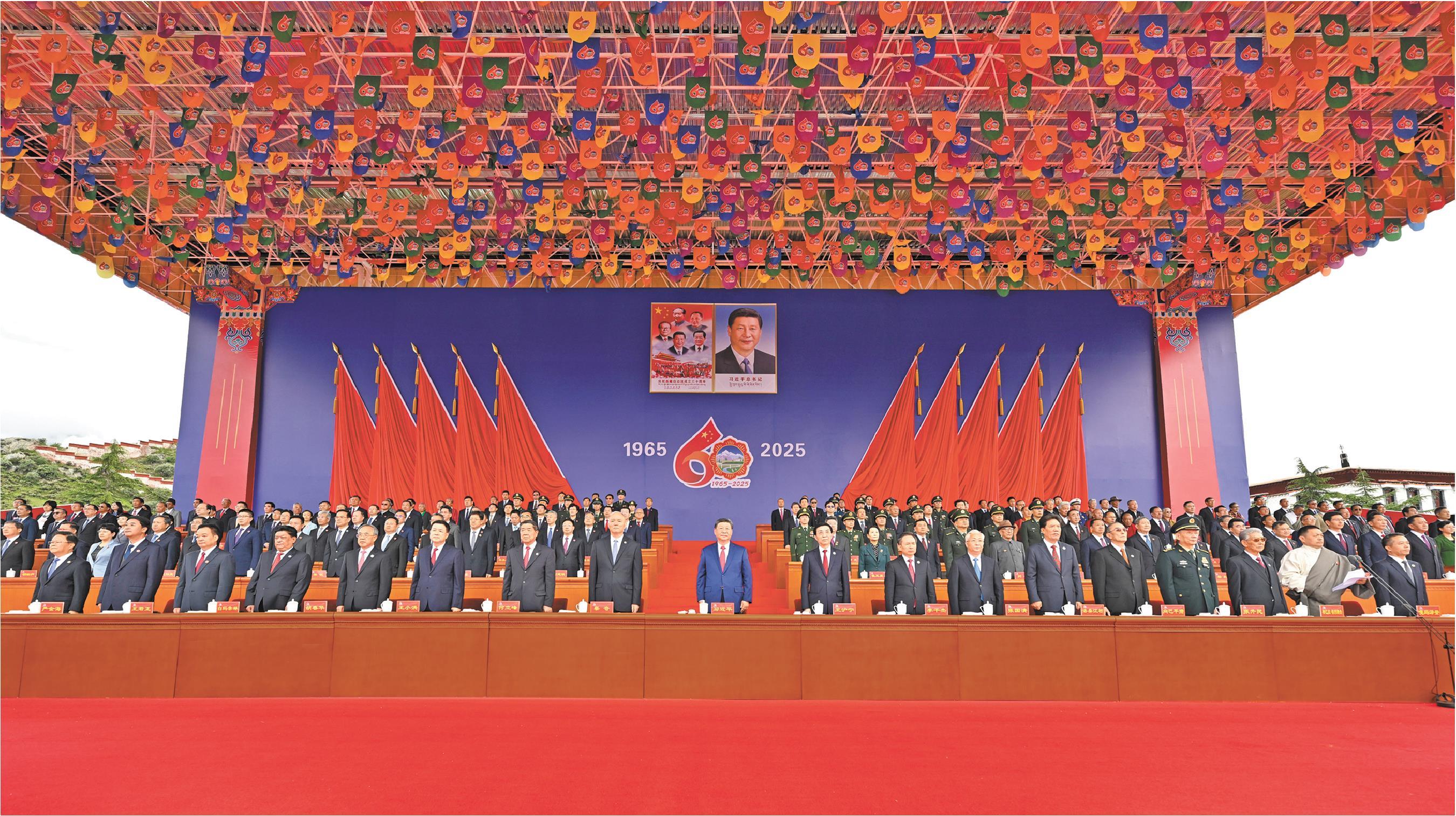 王沪宁发表讲话。他说,1965年9月,在党中央亲切关怀和党的民族政策光辉照耀下,西藏自治区宣告成立。这是西藏发展史上具有划时代意义的大事,巩固了西藏和平解放和民主改革的伟大成果,实现了西藏社会制度的历史性跨越。60年来,西藏经济社会全面发展,民族区域自治制度成功实践,民族团结日益巩固,各族人民生活蒸蒸日上,充分展现了中国共产党领导的坚强力量,充分展现了我国社会主义制度的显著政治优势。