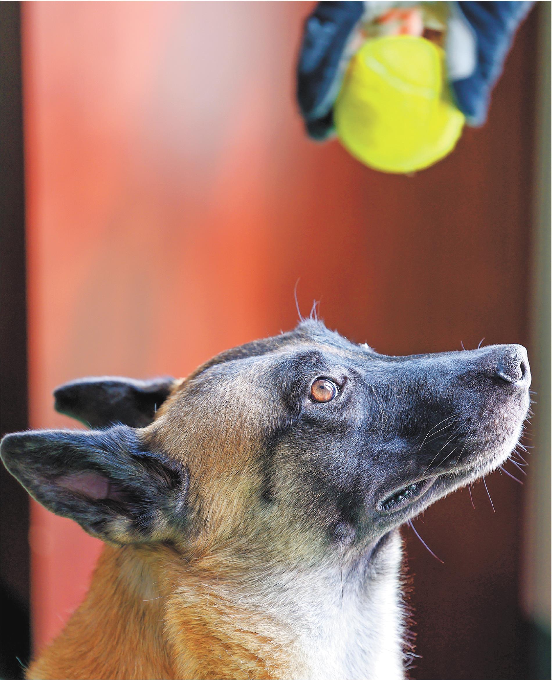 搜救犬“吉米”在箱体搜索训练中,通过人体气味成功找到“被救人员”后,助训员对“吉米”进行奖励。