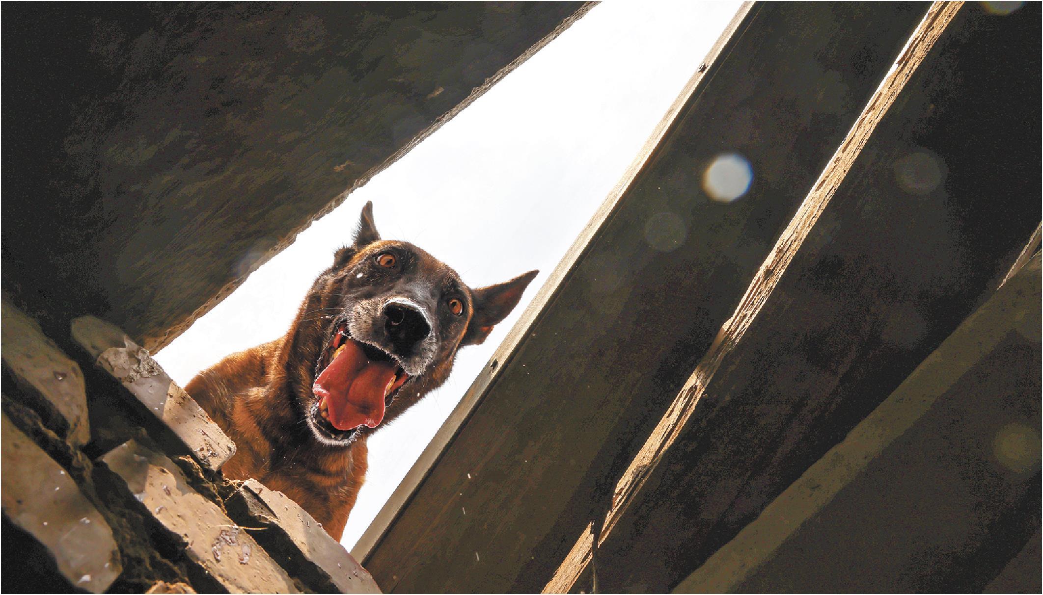在救援现场,搜救犬的吠叫能给被困人员带来生的希望。