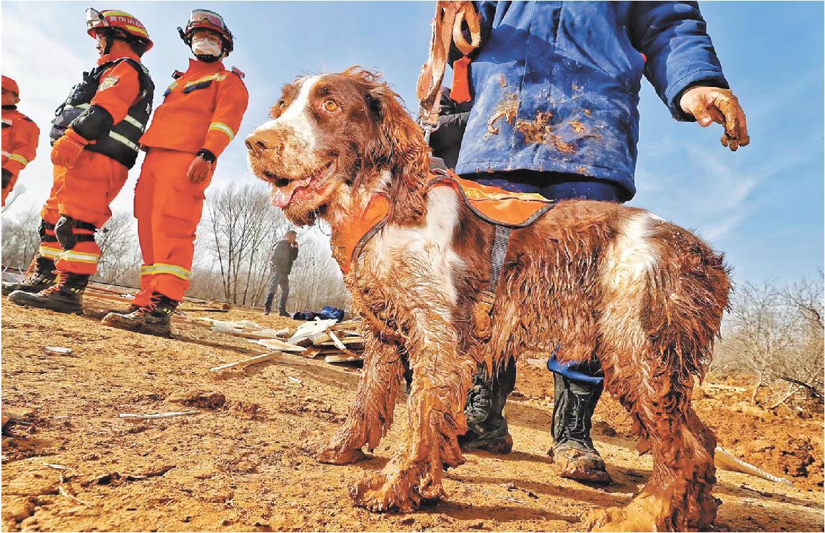 2023年12月,史宾格搜救犬在甘肃地震现场展开搜寻。(中国救援山东搜救犬机动专业支队 蒋韩 摄)