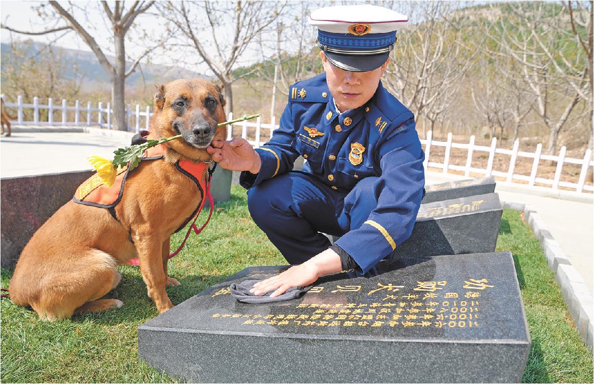2025年清明节,消防员和搜救犬在墓园为功勋犬“贝贝”扫墓。(图片由中国救援山东搜救犬机动专业支队提供)