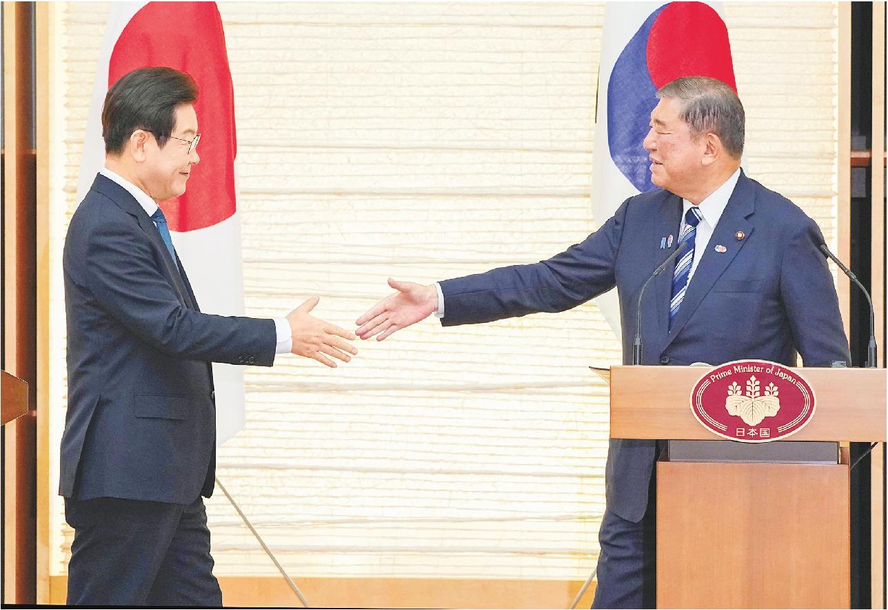 8月23日,在日本东京,韩国总统李在明(左)与日本首相石破茂在共同记者会后握手。(□新华社发)