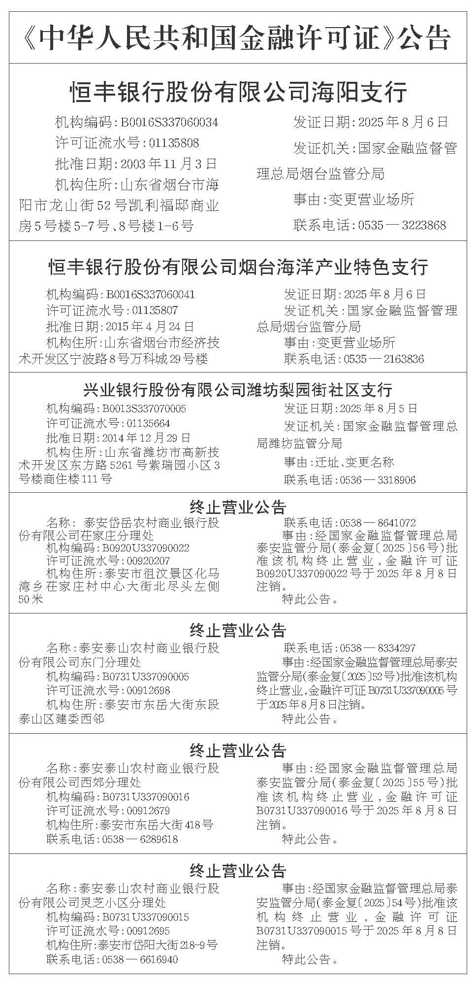 事由:经国家金融监督管理总局泰安监管分局(泰金复〔2025〕56号)批准该机构终止营业,金融许可证B0920U337090022 号于2025年8月8日注销。