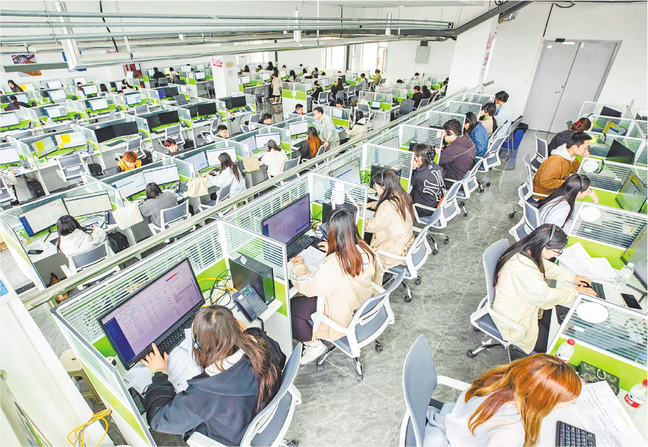 日照数字服务外包基地大学城分园区,外包客服工作人员正在工作。
