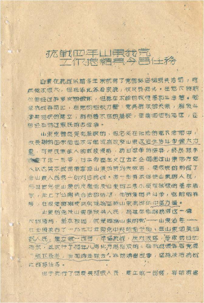山东是受日本侵略最早最深的地区之一。全民族抗战爆发后,山东军民成功开辟了山东抗日根据地,为中国的抗日斗争乃至中国革命提供了重要战略基地。山东省档案馆珍藏的山东抗日根据地档案内容翔实、系统完备,全景再现了山东抗日根据地建设发展的光辉历程,真实反映了中国共产党领导山东抗日根据地军民顽强抗敌、敢于胜利的丰功伟业。