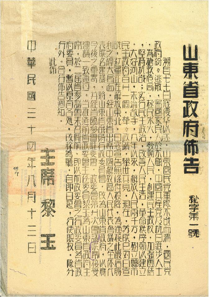 在世界反法西斯战争胜利前夕,1945年4月,中共七大召开,号召解放区军民迎接即将到来的全面大反攻,彻底打败日本侵略者,建立一个新民主主义的中国。8月9日,毛泽东发表《对日寇的最后一战》,8月12日,山东军区政治部下发《战斗动员令》:“朱总司令已颁布命令,我全军向附近各城镇交通要道之敌伪发出通牒公告,限期缴出全部武装,如遇敌伪拒绝投降缴械,即予以坚决消灭。”山东部队全力展开五路大反攻,济南、青岛、徐州、连云港等城市均处在山东解放区的包围之中,胶济路、津浦路、陇海路均被我切断,取得巨大胜利。8月13日,山东省战时行政委员会改为山东省政府,成为“名副其实的山东人民的唯一民主政府”。12月27日,日本投降代表正式在济南递交投降书。山东军民同全国军民浴血奋战,终于夺取了中国人民抗日战争的伟大胜利。